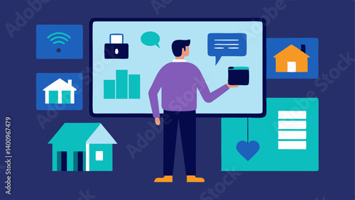 Man buying new cell phone. Seller showing smartphone to customer, flat vector illustration. Phone store interior.