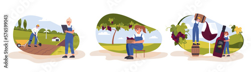Man collect mushrooms in a forest. Man fishing on a lake. Summer holiday and weekend acticities vector concept illustration. Fisherman on a pier, forest mushrooms. Web site design template.
