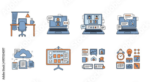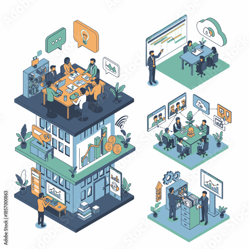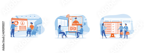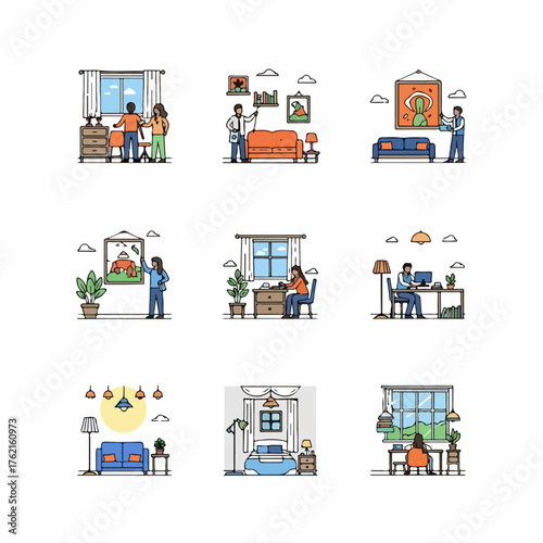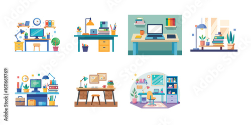 Man daily life set, flat vector illustration. Businessman waking up, taking shower, having breakfast, commuting to work, working in office, training at gym. Daily morning routine, everyday activities.