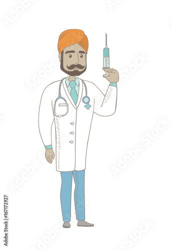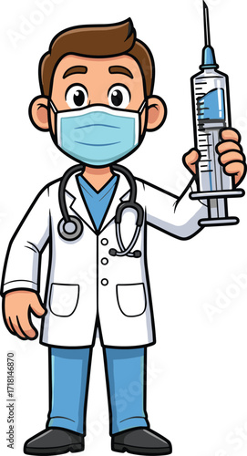 Man doctor holding syringe with vaccine vector icon isolated on white background