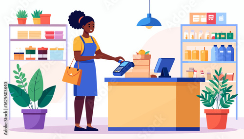 Man dusting furniture in living room, flat vector illustration. Housework, household chores, housekeeping, house cleaning.