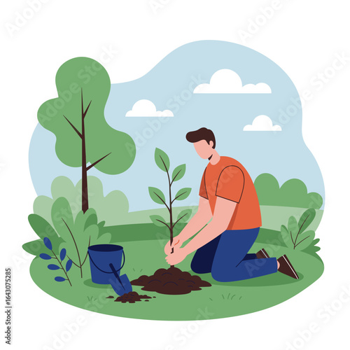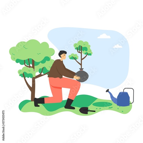 Man planting tree in city park, flat vector illustration. Volunteer, ecologist helping to save planet. Environmental protection, ecology, volunteering, save nature.