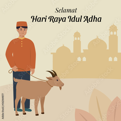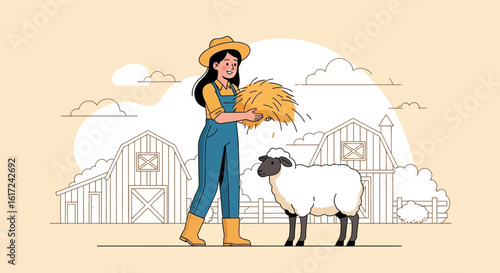 Man farmer taking care of cow at stall vector illustration. Male farm worker standing with pitchfork at livestock isolated on white background. Agriculture and village farmland concept