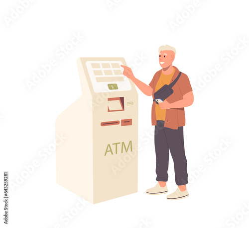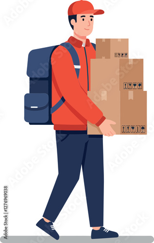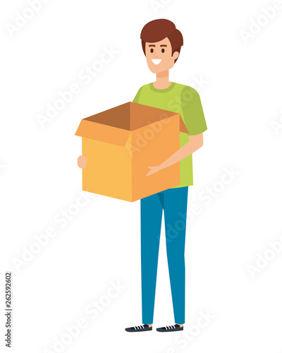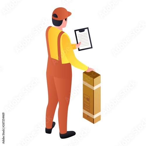 Man in exoskeleton lifting heavy box isometric vector. Robotic mechanical wearable walking suit for disabled people in work isolated on white background
