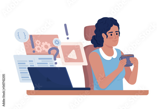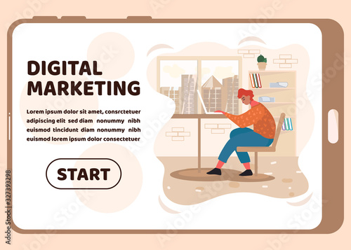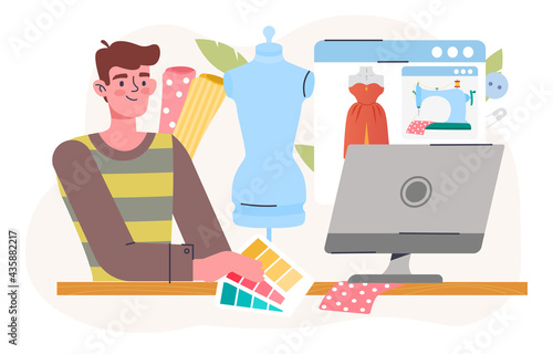 Man in panic because of computer error. Happy family and cat at home in front of computer. Concept illustration. Vector web site design template. Landing page website illustration.
