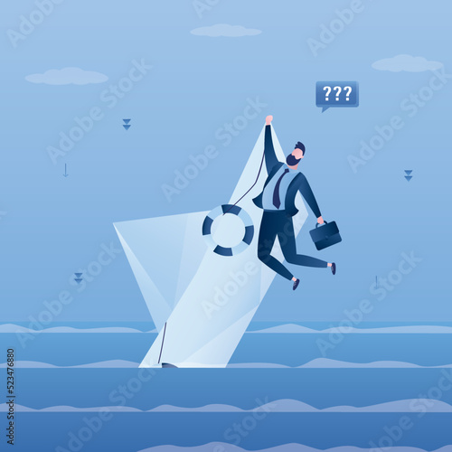 Businessman in sinking paper boat unable to repay outstanding debts vector illustration. Business bankruptcy, financial crisis concept