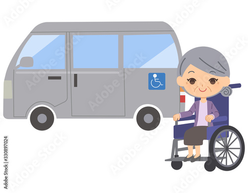 Barrier free environment vector. Man in wheelchair rides on ramp to bus illustration. Equal opportunities and common space for people with different physical abilities