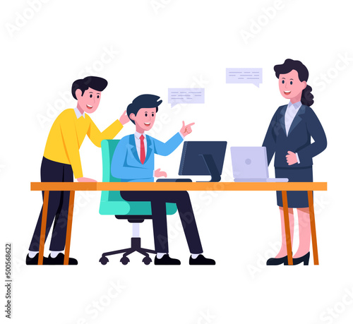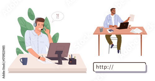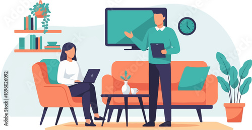 Man job sicker having online interview with female hr manager via computer vector illustration. Hiring employee and recruitment agency concept