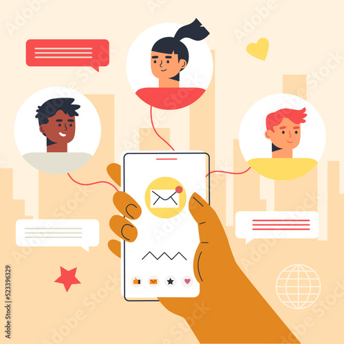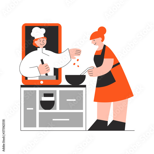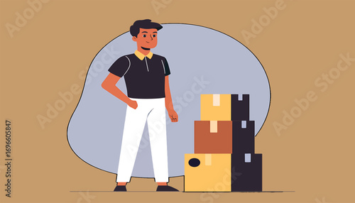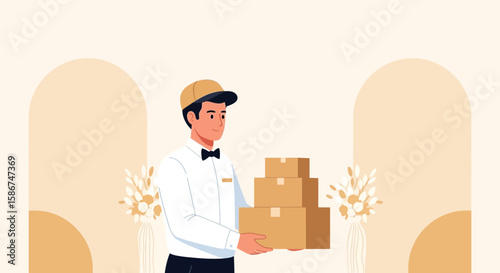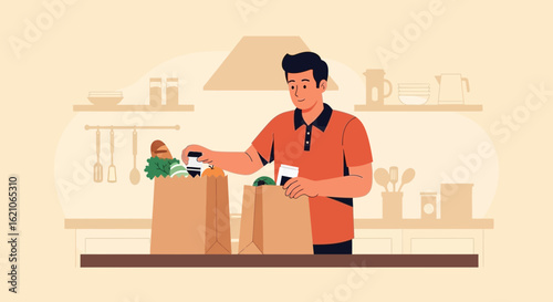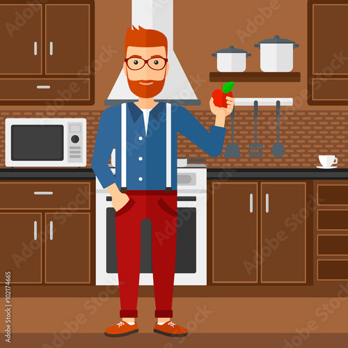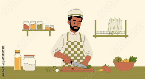 Bearded man holding three layer cake with cherries in kitchen. Vector illustration in flat style. Cake making and decorating hobby concept design element.