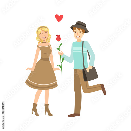 Man making surprise for woman giving gift box vector illustration isolated on white background. Loving boyfriend presenting wrapped pack to girlfriend. Birthday celebration and greeting concept