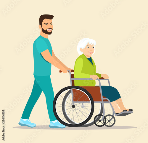 Man nurse care for old senior disabled person in wheelchair vector. Caregiver assist to handicapped patient on walk. Nursing, volunteering and charity service concept