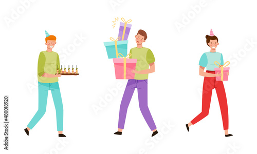 Man presenting gifts wrapped pack and balloons for woman vector illustration. Happy loving family couple with presents isolated on white background. Love relationship and surprise concept