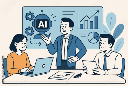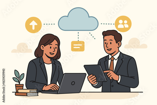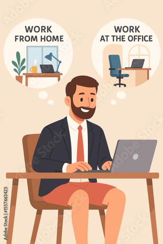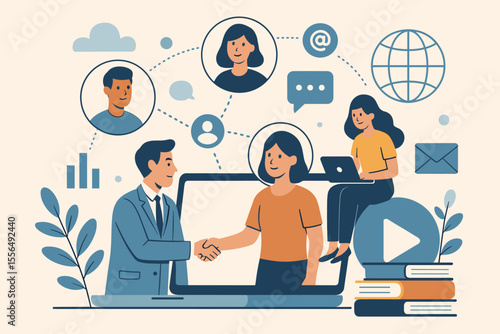 Man remotly working with different people using online communication. Vitrual business team concept vector illustration. Video call, telecommuting, vitrual communication, online work.