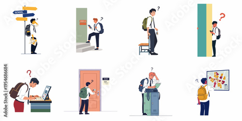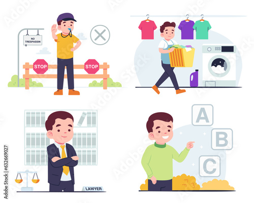 Male characters repairing leaking pipe under kitchen sink or installing tap and cleaning toilet, flat vector illustration. Housework, housekeeping, house cleaning.