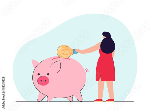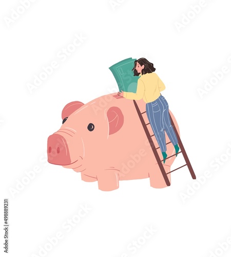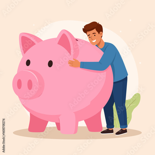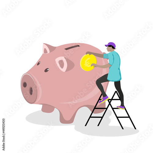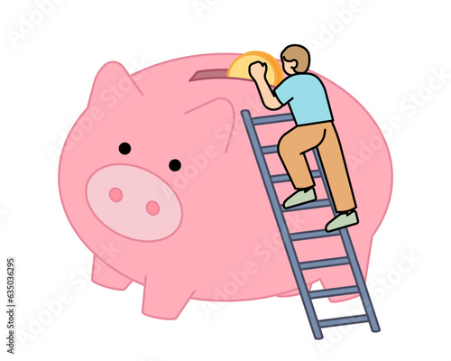 Man save money coin in piggy bank vector. Isometric character and investment, savings or making money 3d illustration isolated on white background