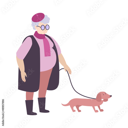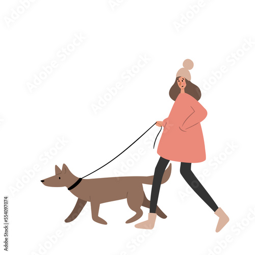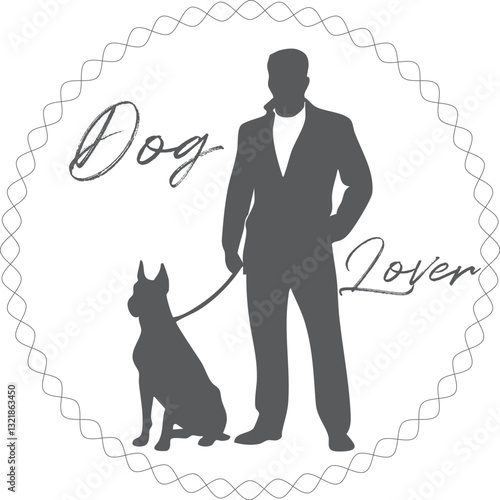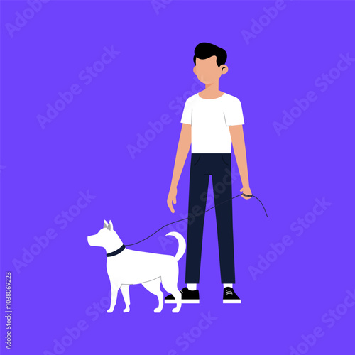 Man walking dog on leash vector. Pet lover icon. Owner puppy isolated on white background