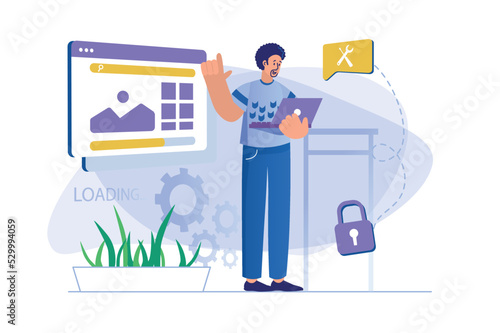Man washing window in living room, flat vector illustration. Housework, household chores, housekeeping, house cleaning.