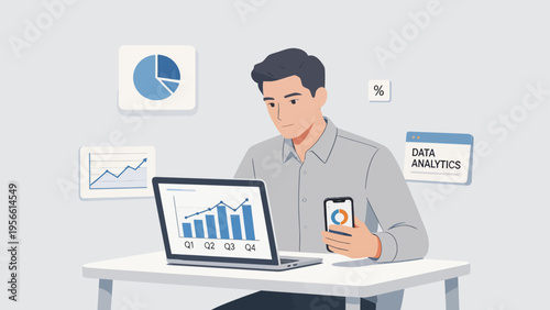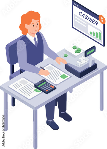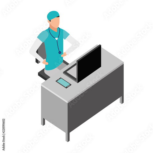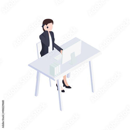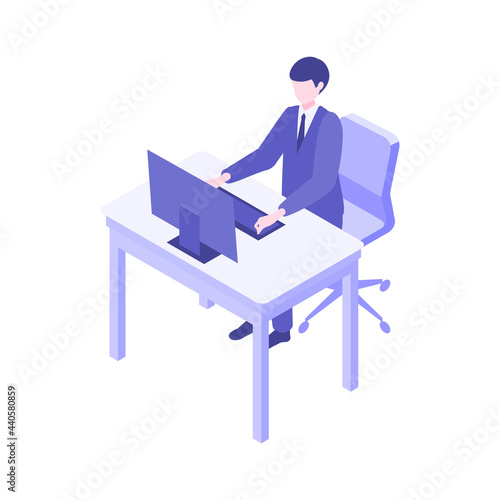 Man working at computer vector. Remote work icon. Designer freelancer, businessman at workplace isolated on white background