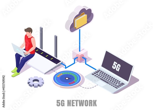 5g cellular network. Man working on laptop, transferring data, testing new high speed internet while sitting on router, flat vector isometric illustration. 5g new generation of wireless technology.