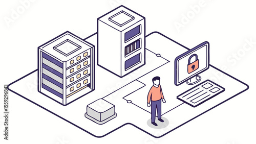 Businessman working on laptop using cloud system, flat vector isometric illustration. Data storage, cloud computing technology.