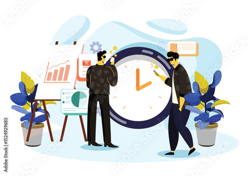 Manicure services, vector flat illustration. Big electric nail drill machine and tiny women holding scissors, nail polish. Beauty salon professional manicure, nail tools concept for web banner etc.