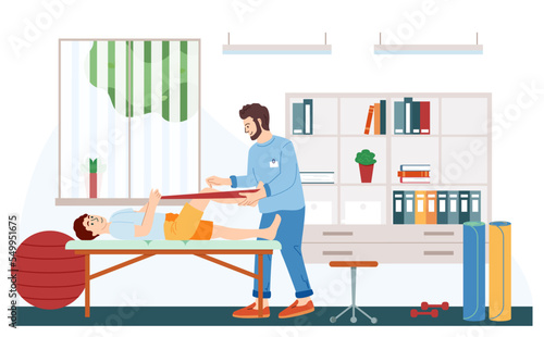 Massage therapist, male cartoon character, masseur giving back pain treatment massage to man lying on table, flat vector illustration. Relaxing, professional therapeutic massage. Spa salon, clinic.