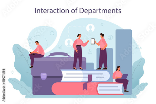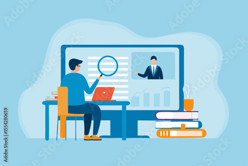Meat store, flat vector illustration. Salesman standing at display fridge counter with fresh pork, beef, sausage. Farm food market. Butchers shop. Supermarket, grocery store meat section, department.