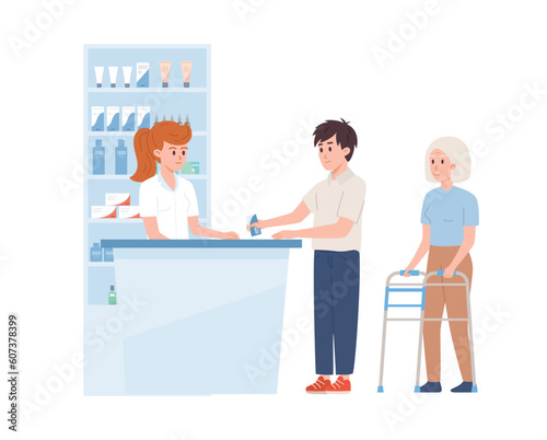 Vector illustration of disabled young woman training with dumbbells, getting support of doctor physiotherapist male in rehab center. Medical care and rehabilitation concept flat style design.