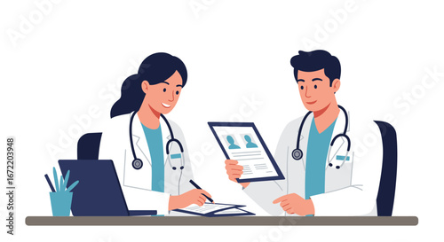 Vector illustration of smiling doctor male in white coat with stethoscope holding clipboard or medical report. Medical doctor therapist flat style design element, icon isolated on white background.