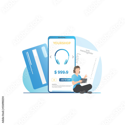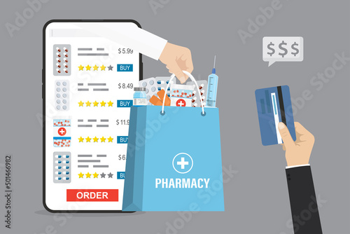 Medical insurance online vector illustration. Smartphone with insurance policy, shield, medicine items, finger tapping buy button. Isometric composition for poster, banner, website page, etc.
