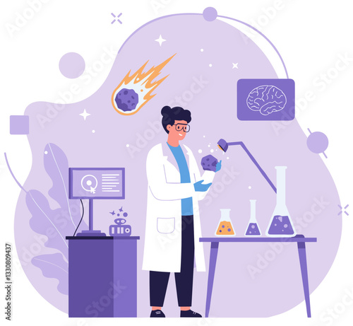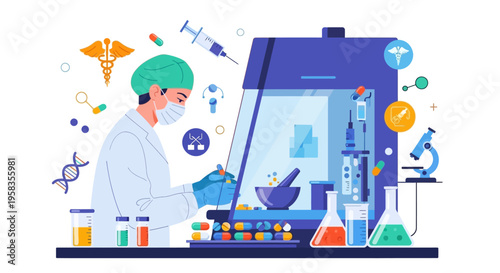 Lab professionals studying corona virus, vector flat illustration. Medical scientists inspecting human lungs infected by respiratory corona virus, developing vaccine, working with patient specimens.