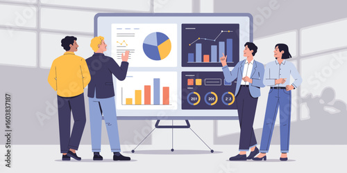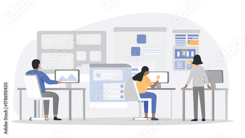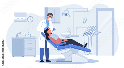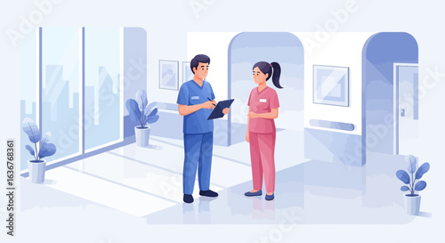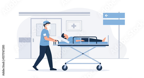 Fluoroscopy exam in hospital, clinic, flat vector illustration. Patient woman lying on medical table, xray machine taking image of broken leg, doctors looking at xray pictures. Bone fracture, injury.