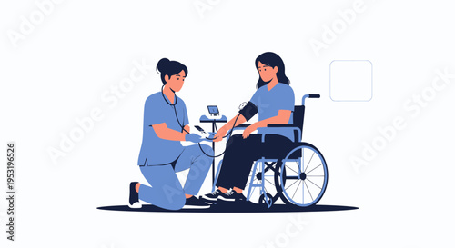 Young man pushing wheelchair or invalid carriage with disabled woman sitting in it. Medical assistance, social support, nursing home, help for people with disabilities.