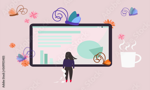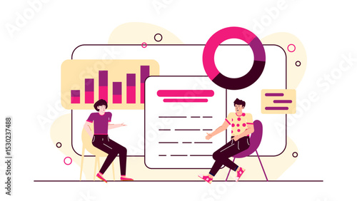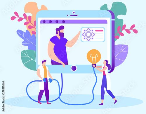 Vector illustration of big computer monitor and people cartoon characters with syringer, magnifying glass, laptop. Telemedicine, online medical consultation concept for web banner, website page etc.
