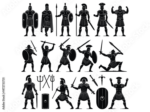Medieval knight icon set. Vector illustration of medieval cartoon characters king, queen, peasants, knights with spears, archer, castle, sword, shield isolated on white background. Flat style design.