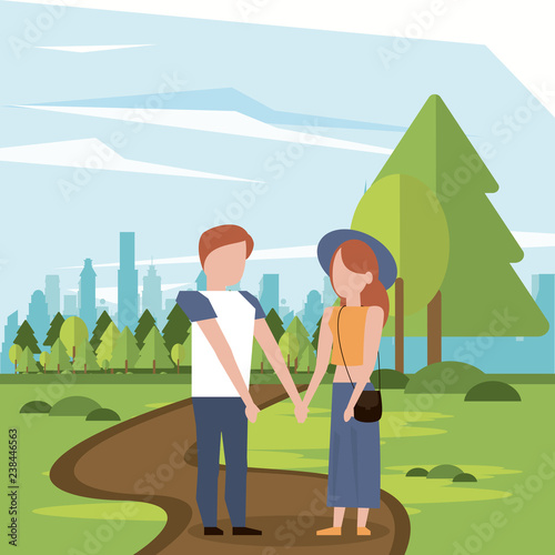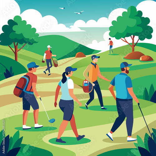 Vector illustration of medieval scene with knight on horseback with full knights equipment including helmet, mail-shirt, lance and shield, peasants, windmill, countryside landscape. Flat style design.