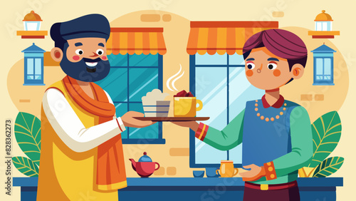 Medieval tavern with waitress and customer vector icon isolated on white background.