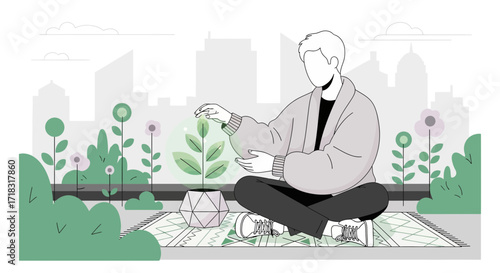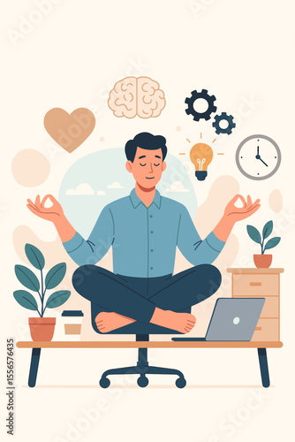 Meditating businessman with speech bubble in retro pop art comic style. Mental balance and yoga concept. Money flying around businessman.