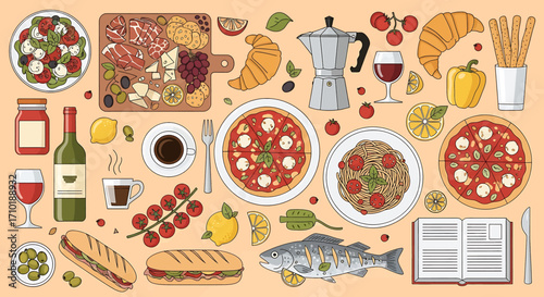 Mediterranean food with fish, salad and vegetables. Woman cooking healthy meal with fresh ingredients. Vector set of hand drawn illustrations and posters.