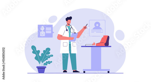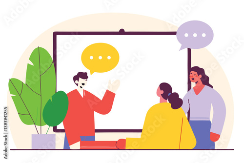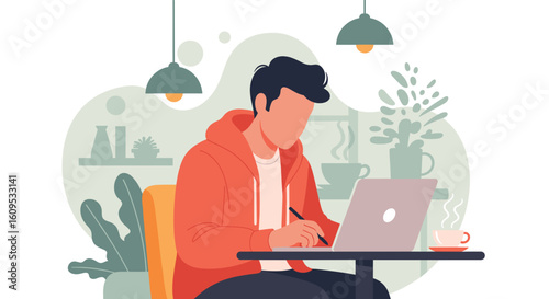 Young man shopping for shoes in menswear fashion boutique, vector flat illustration. Men clothing store interior with trousers, t-shirt, caps, sport shoes on sale, seller and buyer cartoon characters.