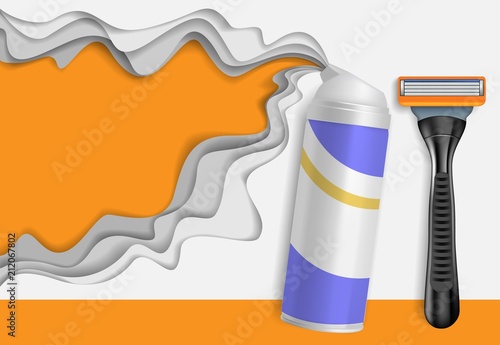 Mens skincare products ad vector paper cut illustration. Shaving foam bottle and wet shave razor mockups, copy space. Shaving products poster, banner design template.