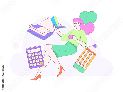 Tampons, pads sanitary napkins and menstrual cup or bowl, tiny female characters, flat vector illustration. Menstrual period feminine hygiene products and devices.