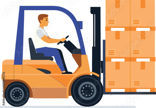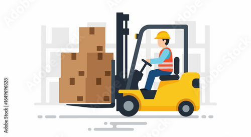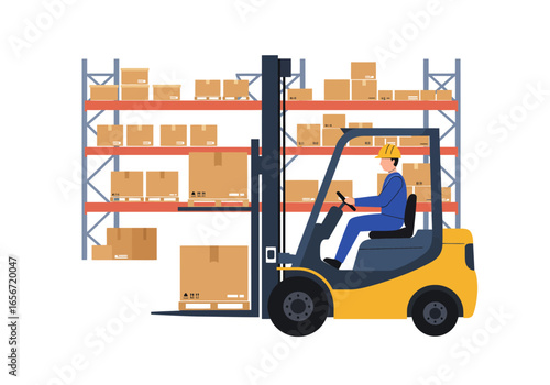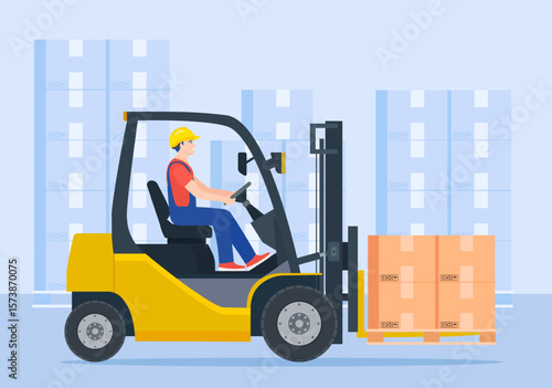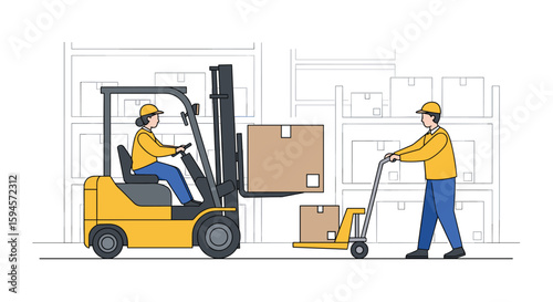 Merchandise warehouse scene set, flat vector isolated illustration. Warehouse workers, loaders, forklift, loading cart, cardboard boxes. Storage services.