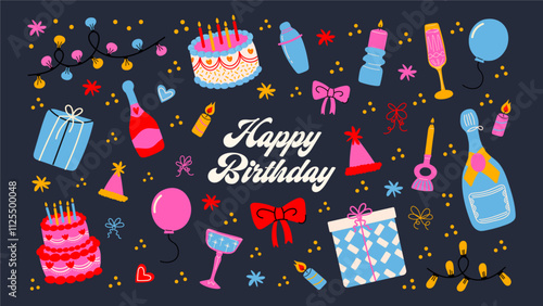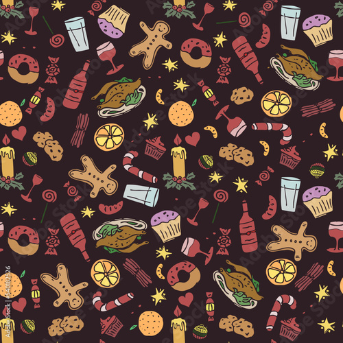 Merry christmas and happy new year greeting card and background template. Winter holiday vector illustration in vintage style. Christmas tree and toys, santa claus. 2021 new year hand drawn poster.