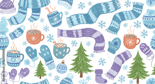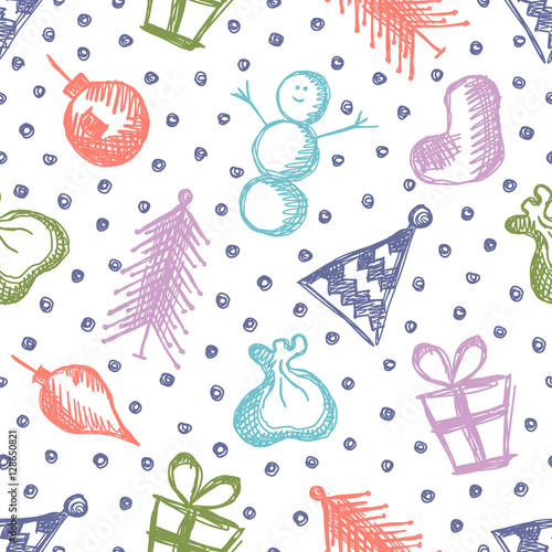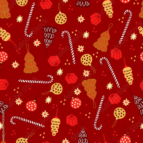 Merry christmas and happy new year greeting card and background template. Winter holiday vector illustration in vintage style. Christmas tree and toys. 2021 new year hand drawn poster.