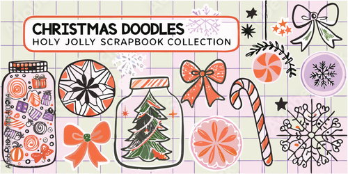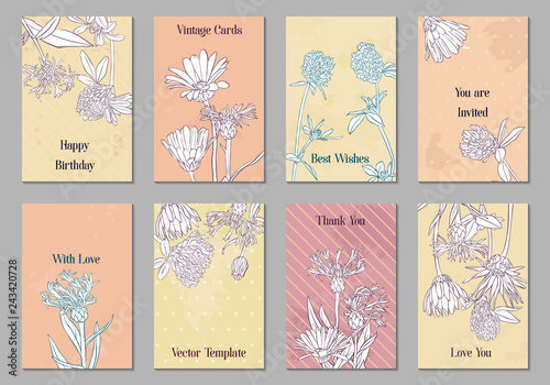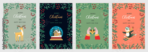 Merry christmas and happy new year greeting cards template. Vector set of winter holiday illustrations in vintage style. Christmas tree and toys. 2022 new year hand drawn posters.
