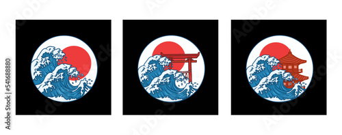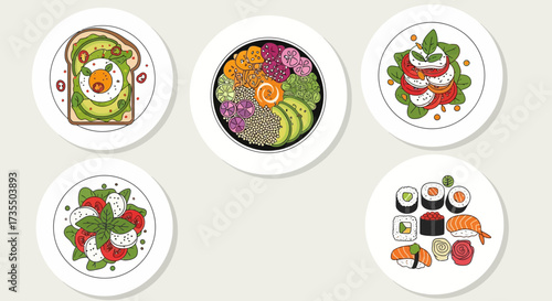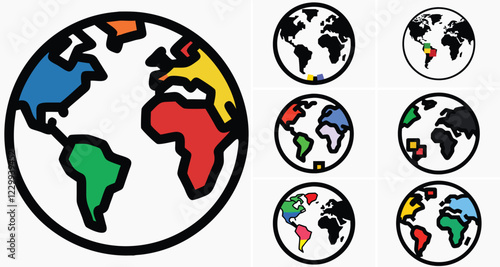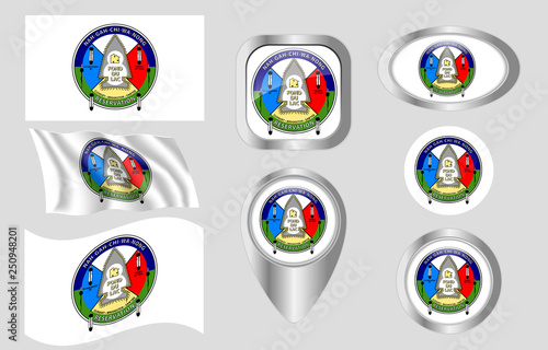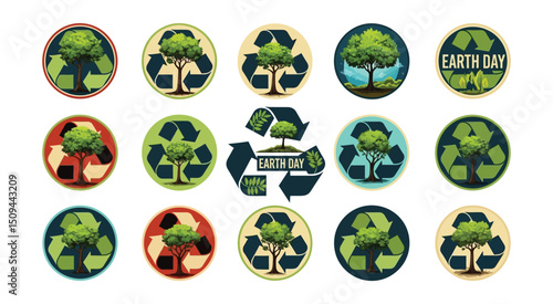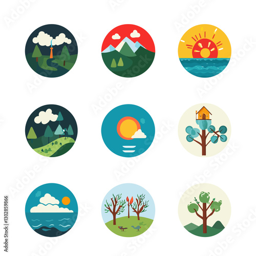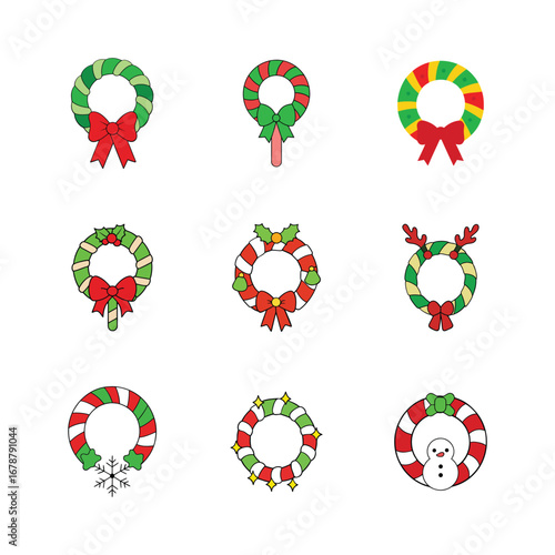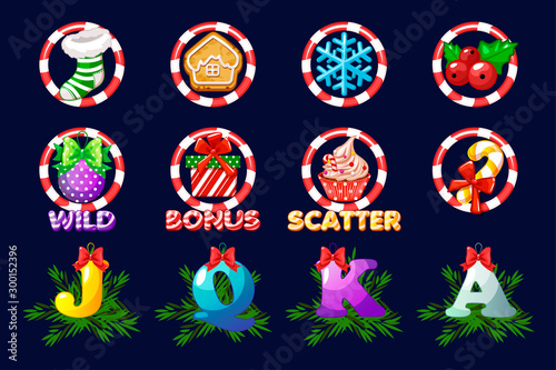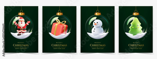 Merry Christmas card set, vector illustration in paper art modern craft style. Winter holidays composition in circle with Christmas trees, stockings, angels, reindeer, gift box, holly berries.