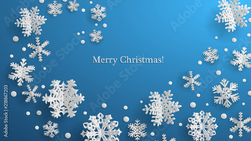 Merry Christmas Happy New Year vector poster design template with beautiful paper cut snowflakes and copy space.