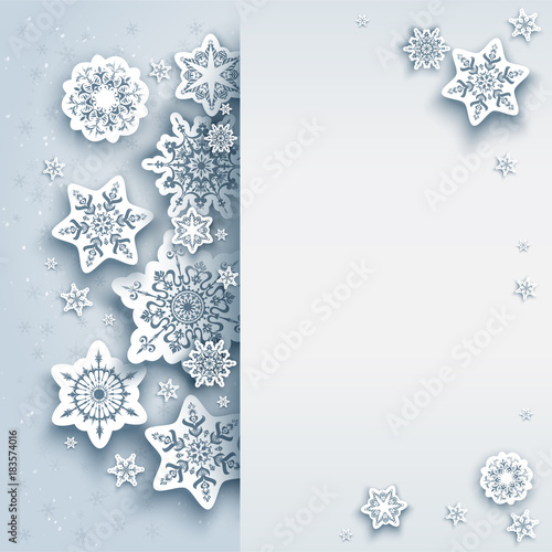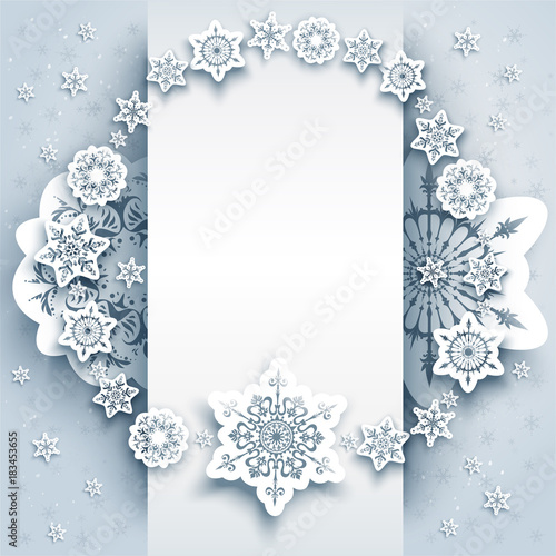 Merry Christmas Happy New Year vector poster design template. Decorative round frame with paper cut snowflakes and copy space.