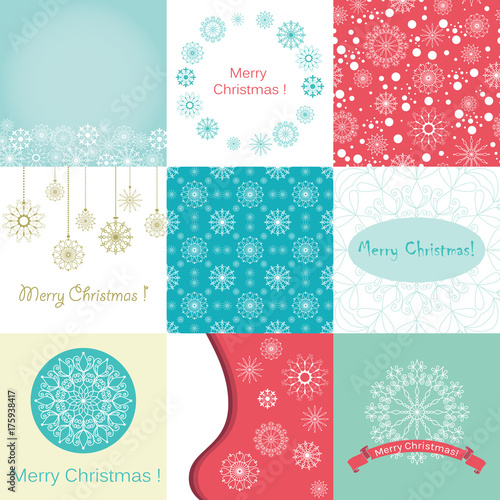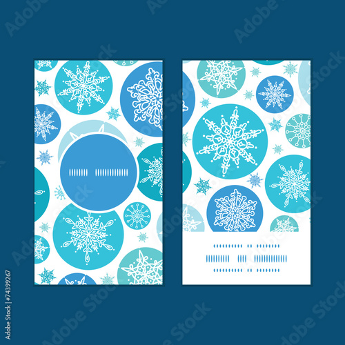 Merry Christmas and Happy New Year poster vector template set with beautiful white paper cut snowflakes on blue background, copy space.